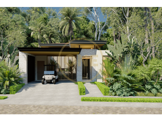 La arquitectura de la villa está pensada para integrarse con la naturaleza, con grandes ventanas en todos los espacios que enmarcan vistas a jardines tropicales y aportan una sensación de calma. En el exterior, una piscina privada se encuentra rodeada de un paisajismo tropical cuidadosamente diseñado, creando un ambiente perfecto para descansar, tomar el sol o refrescarse. La propiedad también incluye cochera techada, ideal para vehículo o carrito de golf, facilitando la movilidad dentro de la comunidad.